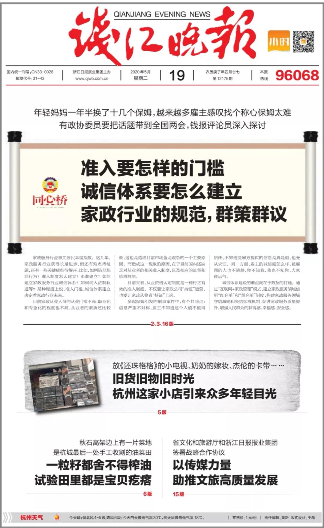 钱江晚报整版报道遐龄荟互联网思维家政服务