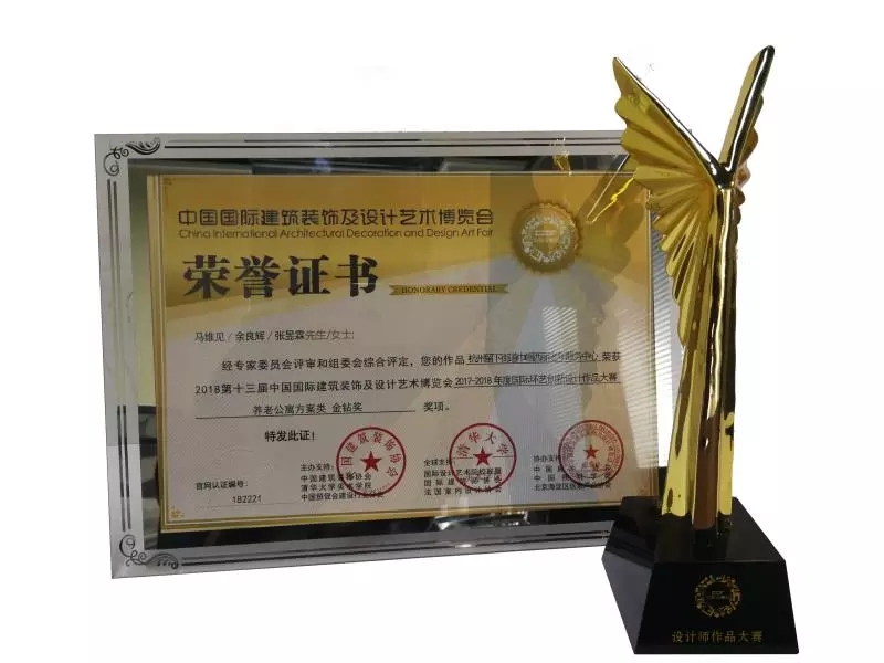 杭州留下街道巾帼西丽老年服务中心项目,在2018年第十三届中国国际建筑装饰及设计艺术博览会的国际环艺创新设计作品大赛中,荣膺养老公寓方案类金钻奖。