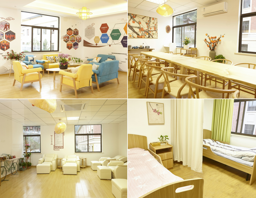 中心面积共1435平方米,一楼是社区卫生服务站和老年食堂,二楼是活动区和日托区,三楼是全托区,四楼平台是户外健身区和楼顶花园。中心具备生活援助和助餐配送餐、日间照料和中短期托养、康复护理、家庭支持、社会工作和心理疏导、辅具租赁、文化娱乐、示范指导、法律维权、志愿服务等十大功能。