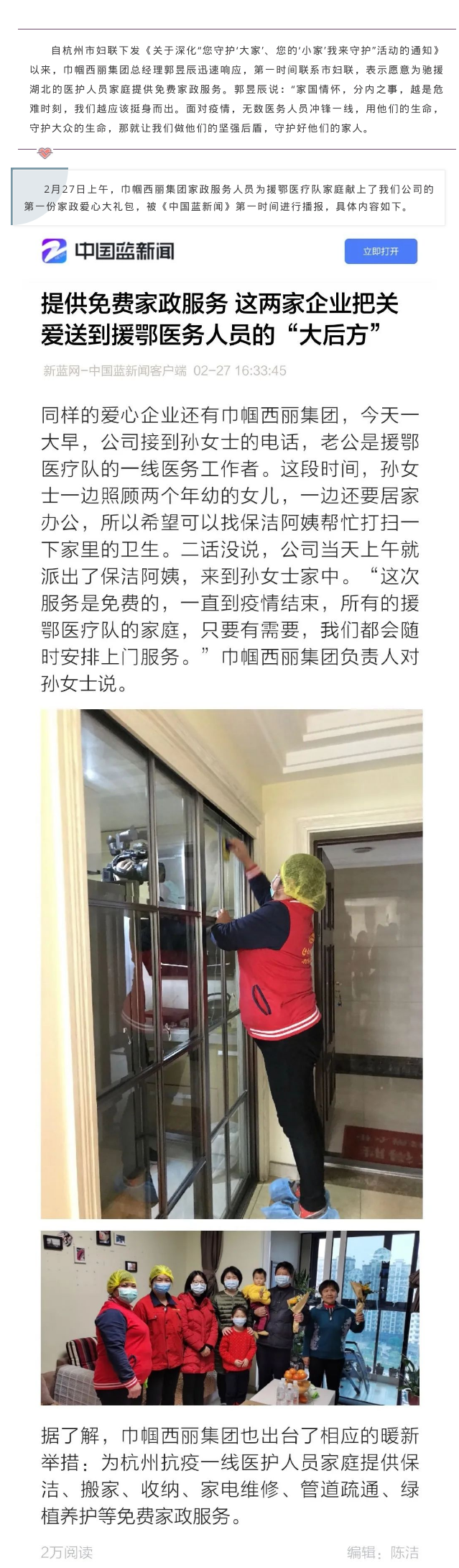 提供免费家政服务,把关爱送到援鄂医务人员的“大后方”