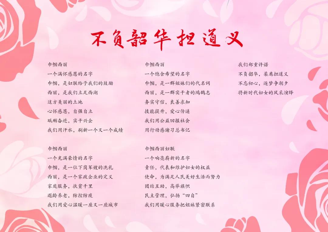 新当选的妇女联合会执委会主席郭昱辰,带领执委会全体成员以一首《不负韶华担道义》的诗歌,做表态发言,他们郑重许诺:“不负韶华,柔肩担道义;不忘初心,逐梦争朝夕;将新时代妇女的风采演绎!”慷慨激昂的话语,飒爽的巾帼英姿,赢得代表们阵阵掌声。