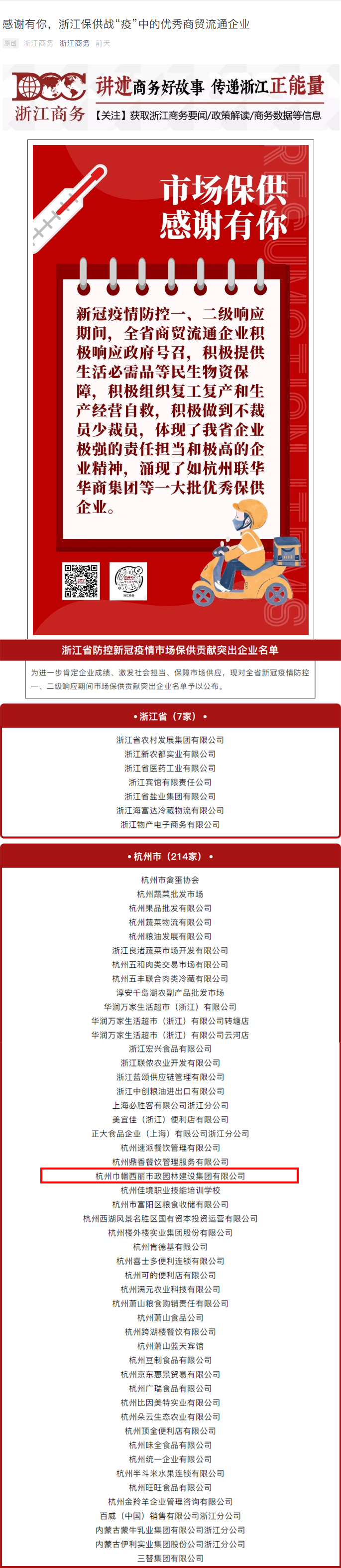 2020年05月25日,浙江商务发布了对全省新冠疫情防控一、二级响应期间市场保供贡献突出企业名单,巾帼西丽市政园林集团位列其中。
