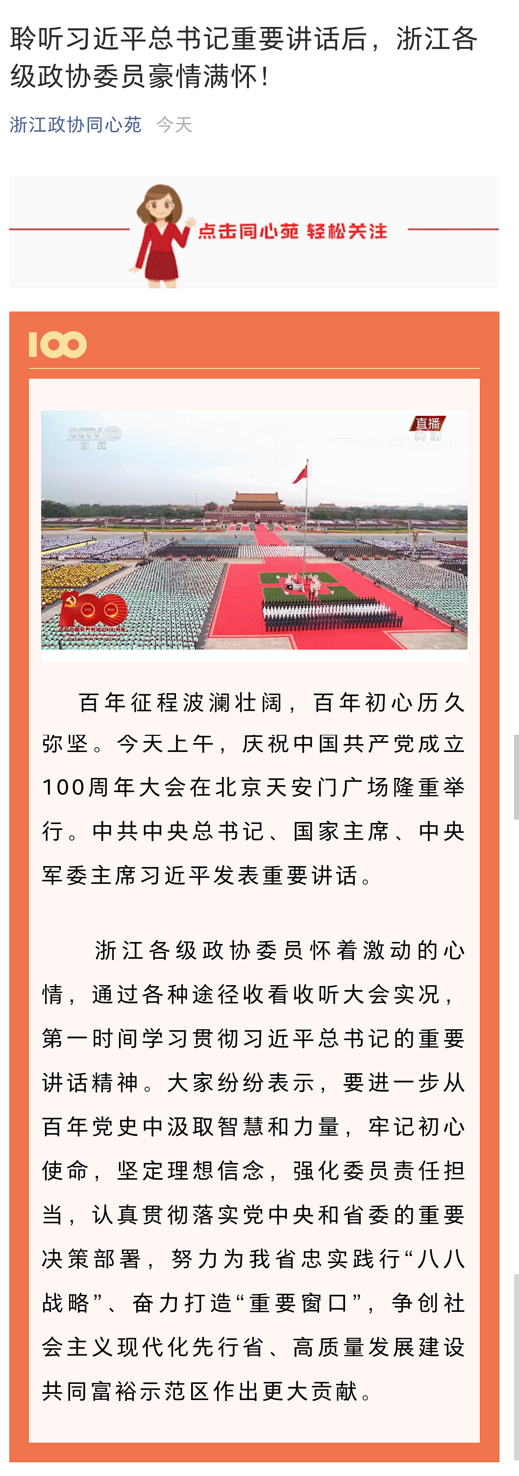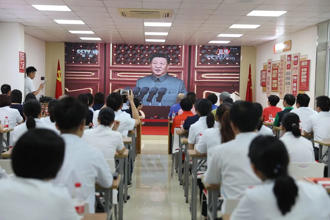 上午8时,“庆祝中国共产党成立100周年大会”在北京天安门广场隆重举行。所有参会人员聚精会神认真收看庆祝大会和习近平总书记在大会上的重要讲话,习总书记讲话高瞻远瞩,大家为民族骄傲和自豪的掌声不断响起。