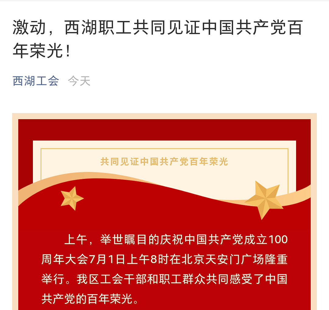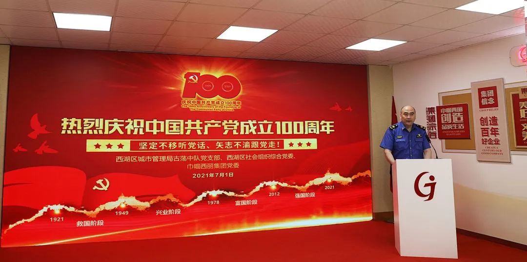 收看七一讲话、观看红色视频、重温入党誓词、老党员分享心得体会、为党庆生……千秋伟业,风华正茂。7月1日,巾帼西丽集团与共建支部西湖区城管局古荡中队党支部、西湖区社会组织综合党委联合举办“贺百年华诞同庆盛世,颂千秋伟业共建前行”主题庆祝活动,缅怀党的光荣历史,讴歌党的丰功伟绩,表达对党的深厚情谊,喜迎党的百岁华诞。