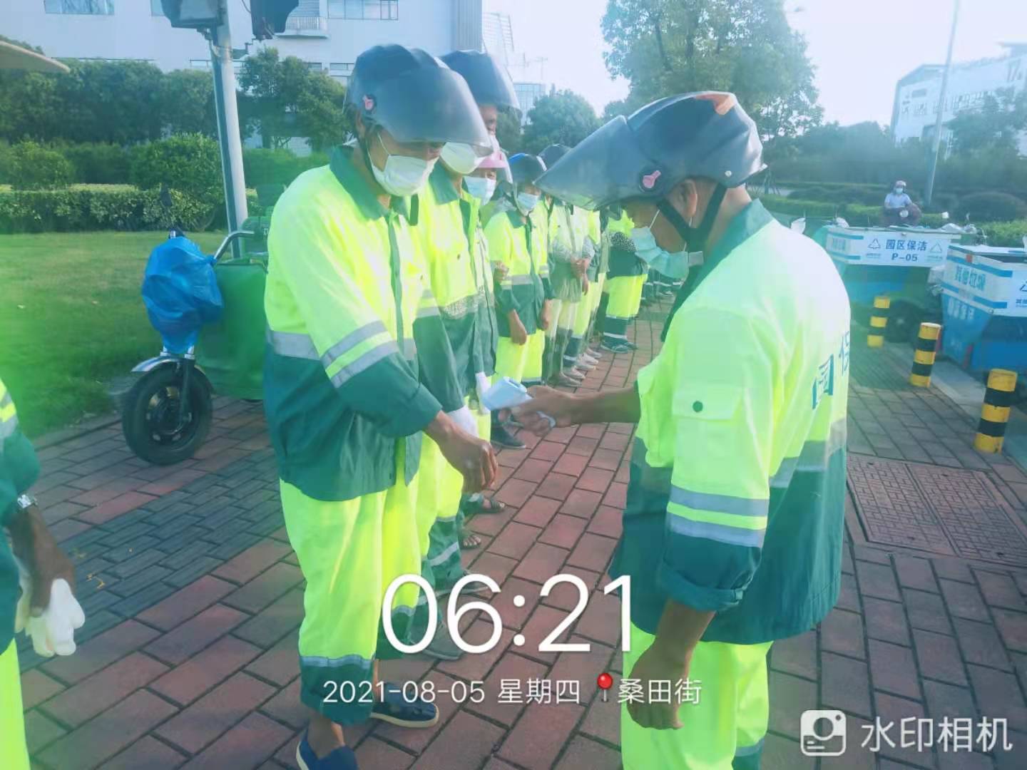 加强物资保障,筑牢抗击疫情防线,口罩、手套和84消毒液一次性备足三个月,并按要求发放给每一位员工。每位员工岗前早晚两次体温测量,作业期间必须配带口罩,对公厕、工棚、果壳箱按要求进行消毒杀菌,并做好相应台账记录。