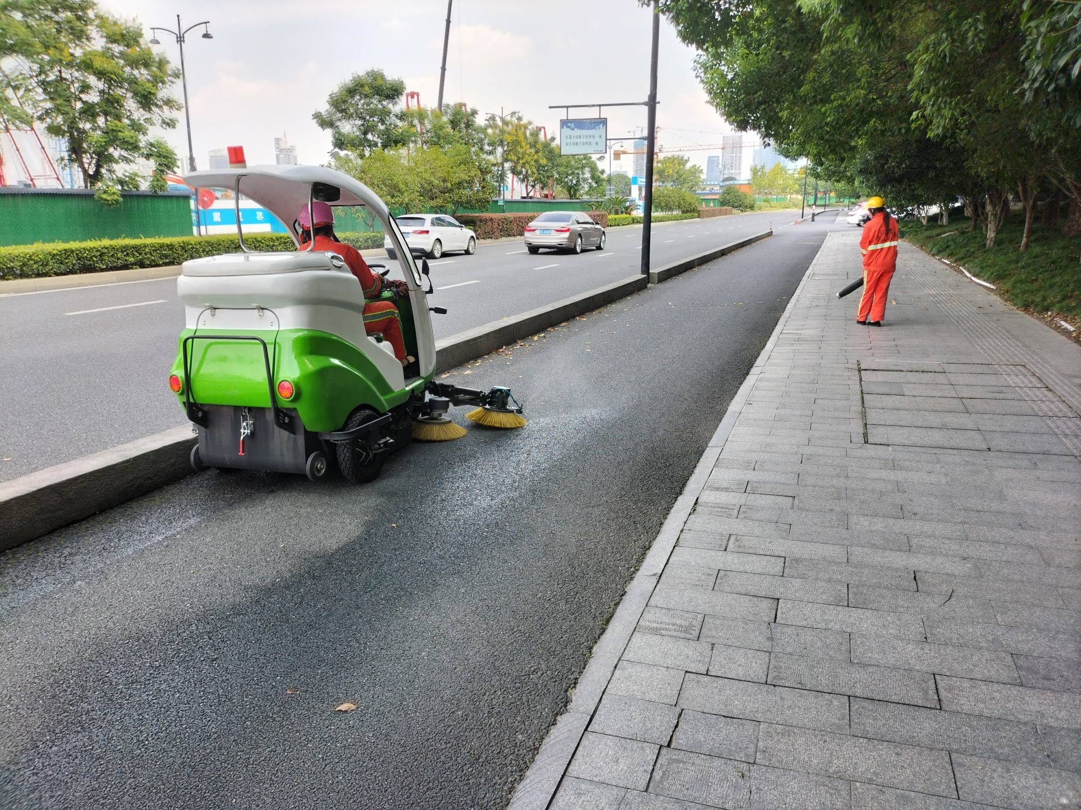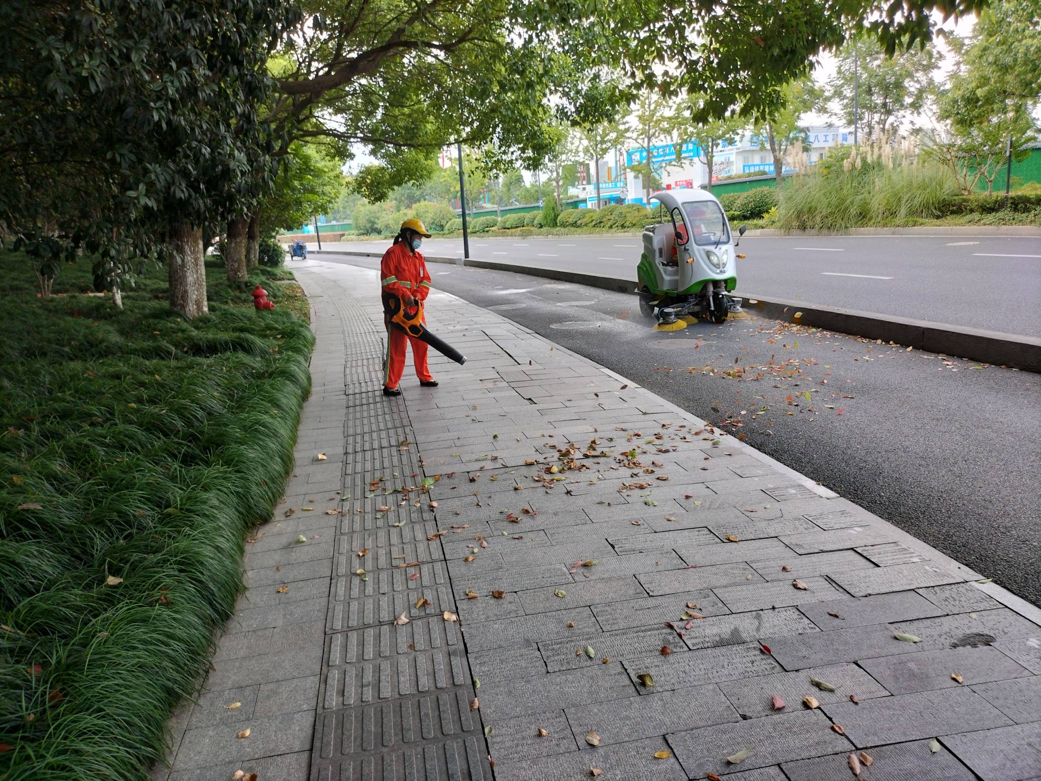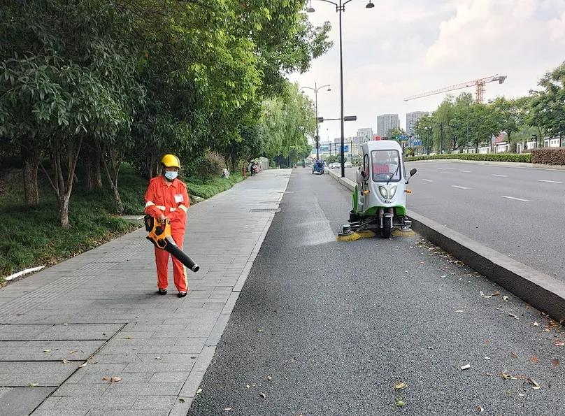 在之江路人行道与慢车道上,一位环卫工人使用手持式锂电大功率吹风机向绿化带、车底、树穴等卫生死角发射“吹气波”。另一位环卫工人驾驶小型纯电动道路清扫车将吹到路面上的落叶清扫处理,两人联合作业,大大提高了之江路落叶的保洁速度。