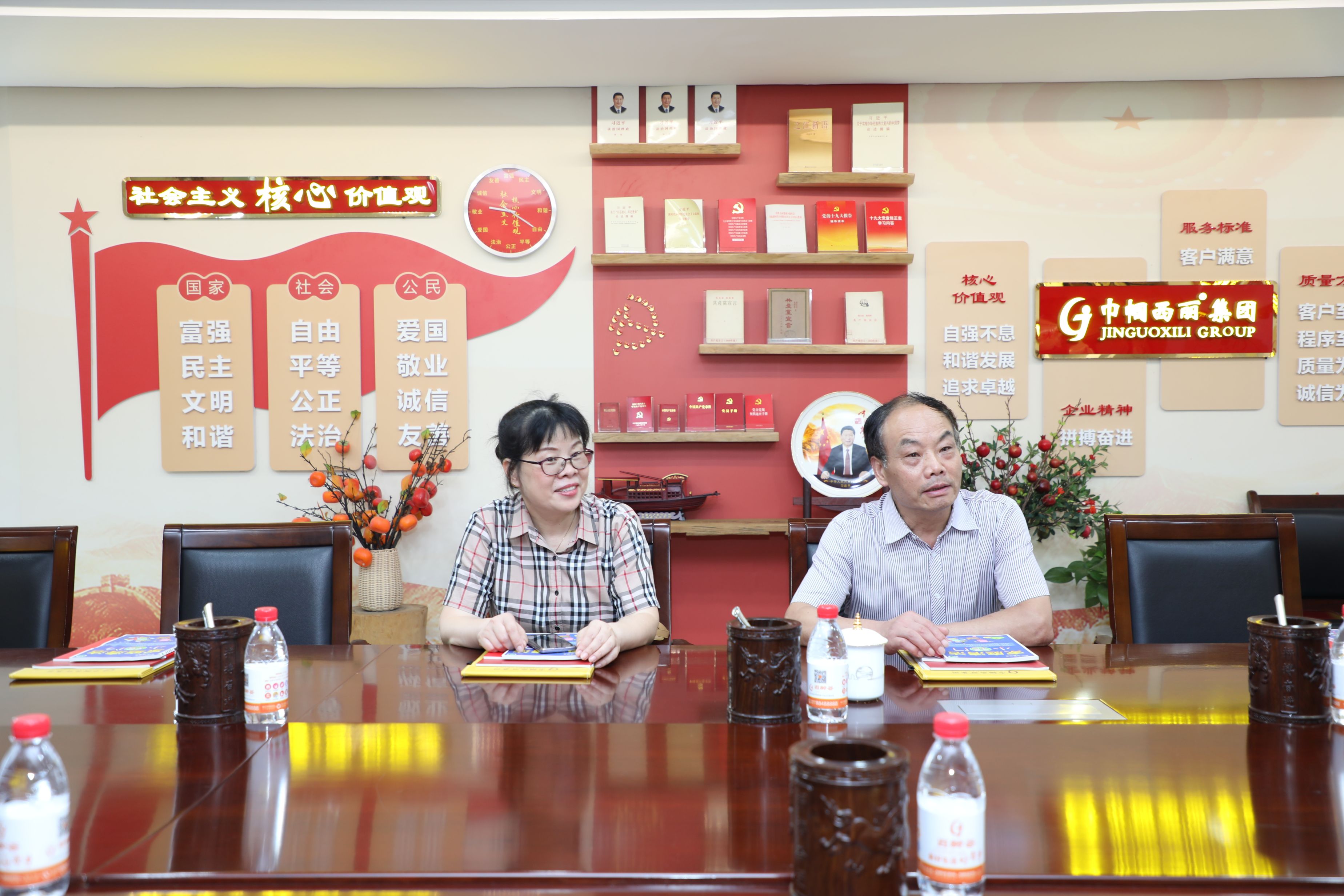 参观结束后,双方来到会议室进行座谈会,就企业建设情况、运营状况等方面进行了深入交流。王会长提出合理化宝贵意见,指出发展新思路,望巾帼西丽继续做优做强,起到行业引领作用。