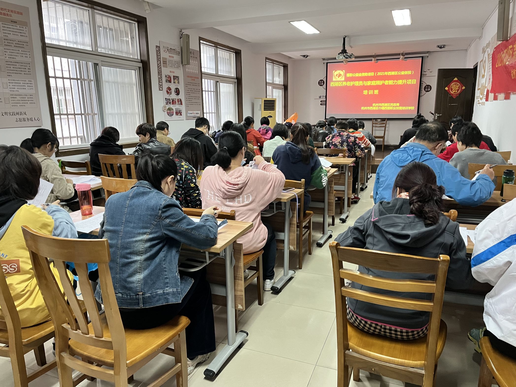 该培训已在三墩镇、西溪街道、翠苑街道、灵隐街道、转塘街道等地方开展。以理论+实操+测试的形式,针对于西湖区各个街道的家庭照护者或社区社工进行培训。