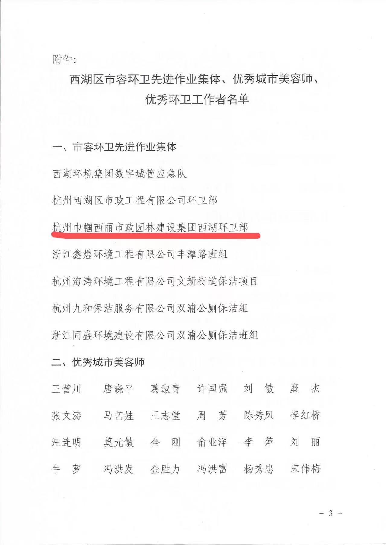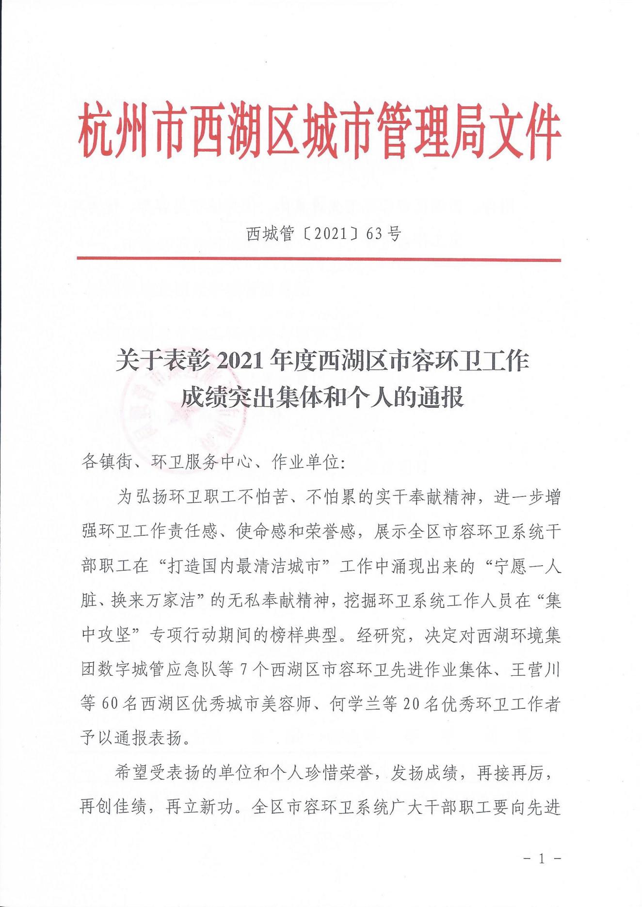 近日,2021年度西湖区市容环卫工作成绩突出集体和个人公布,巾帼西丽集团荣获“西湖区市容环卫先进作业集体”称号。