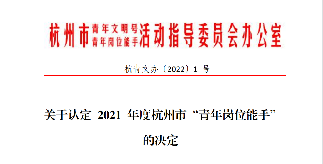 据悉,2021年,杭州市各级团组织围绕“青年职业导航计划”,广泛开展青工技能比武活动,为表彰杭州市在业务技能方面有特长、有创新,在工作岗位上成绩突出、能较好地发挥模范带头作用的优秀青年职工,特设置此项荣誉,充分体现获奖职工在岗位技能上的先进性。