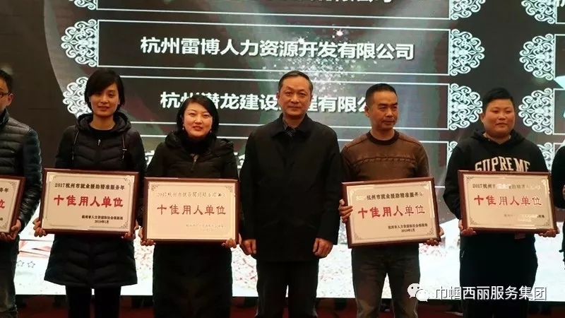 杭州市人力资源和社会保障局主办“杭州公共就业创业服务创新大赛决赛暨2017就业援助精准服务年十佳授牌仪式”,巾帼西丽市政集团荣膺2017杭州市就业援助精准服务年十佳用人单位”。