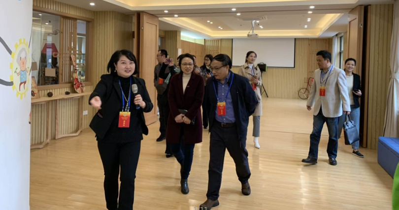 巾帼西丽服务集团总经理郭昱辰向来访领导简单介绍了养老服务中心的楼层布局及服务功能。